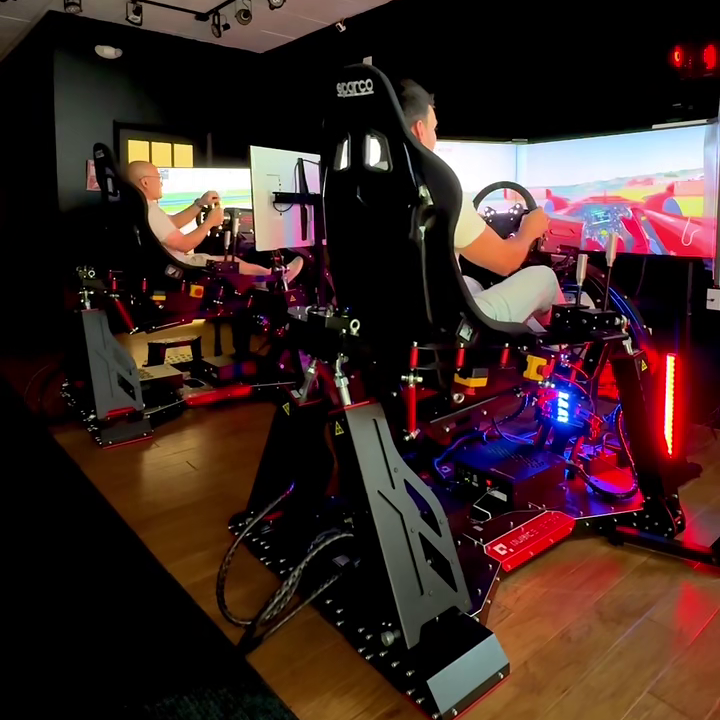 The Qubic System QS-V20 extended 4DOF motion cockpit delivers real-time feedback for braking, acceleration, and cornering. Built for F1, GT, and rally simulations, it uses ultra-fast linear actuators and a triple-monitor setup to fully immerse you in the driver’s seat.
