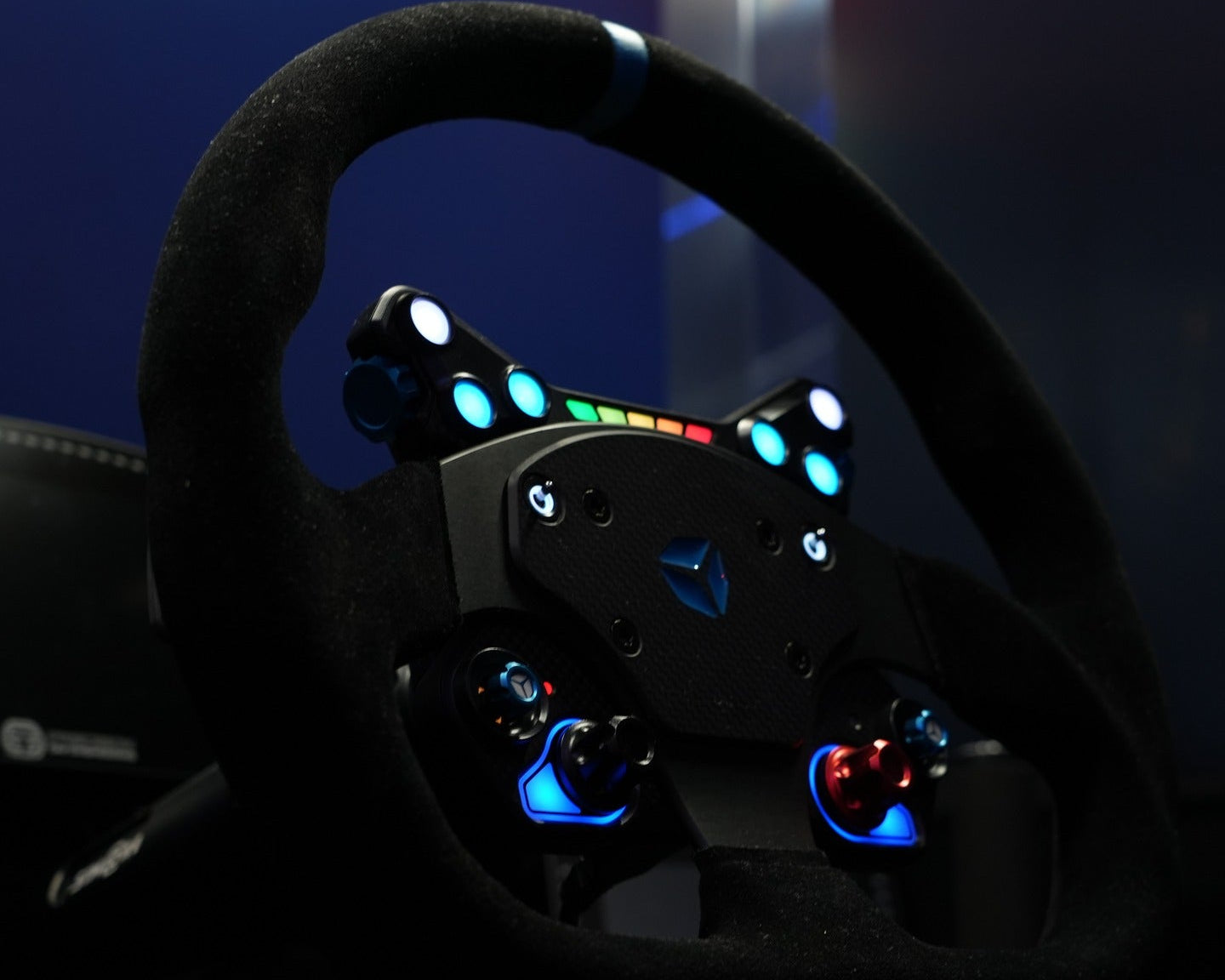 The Cube Controls GT Pro V2 steering wheel offers a race-grade suede grip and precise feedback for realistic handling. It’s designed to give drivers confidence through high-speed corners and tight braking zones.